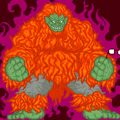 | 灼熱を宿す鋼の体毛を触手のように蠢かし、寄り束ねて槍となす・伸ばして相手を絡めとって焼殺する…などの多岐に渡る使用法を見せる。 生物の中には鉄の殻を持つ巻貝・ウロコフネタマガイのように外部から金属粒子を取り込み、金属で身体器官を構成するものがいる。 それらと同様に、朱厭族は経口摂取した土中・岩中の金属成分で己の毛を形成し、針金の剛毛としてこれを鎧とするのである。 気功の修練を積んだロムスカは体毛に自己の気を通す生命帰還の法により、毛の一本一本を蛇のように随意に動かし伸ばす事ができ、 さらには体内で加速させた気血流が発生させる高温の体熱を毛に伝導し、赤く輝く炎の衣と変えるのである。 |